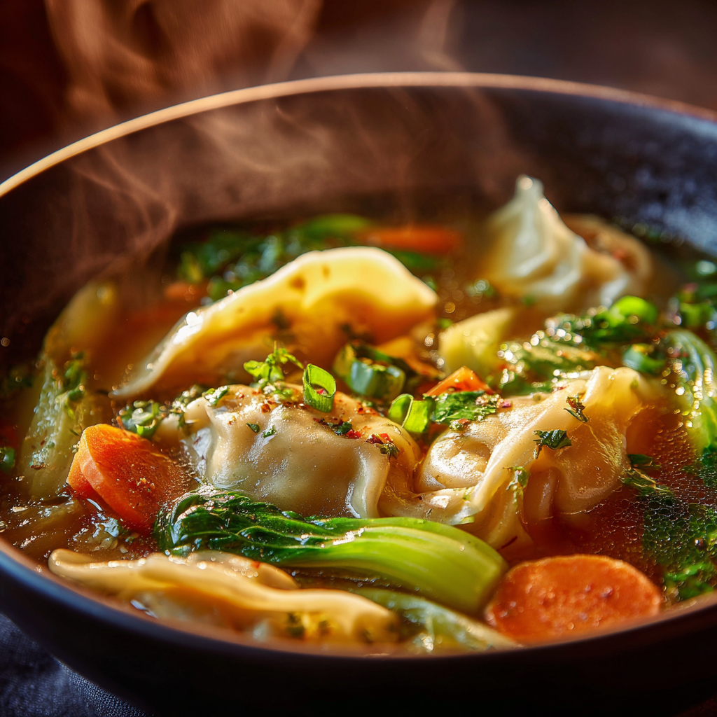 Une soupe parfumée et réconfortante composée de potstickers tendres, d’un bouillon aromatique au gingembre et à l’ail, et de légumes fondants. Prête en moins de 30 minutes, parfaite pour un dîner express plein de chaleur et de saveurs.